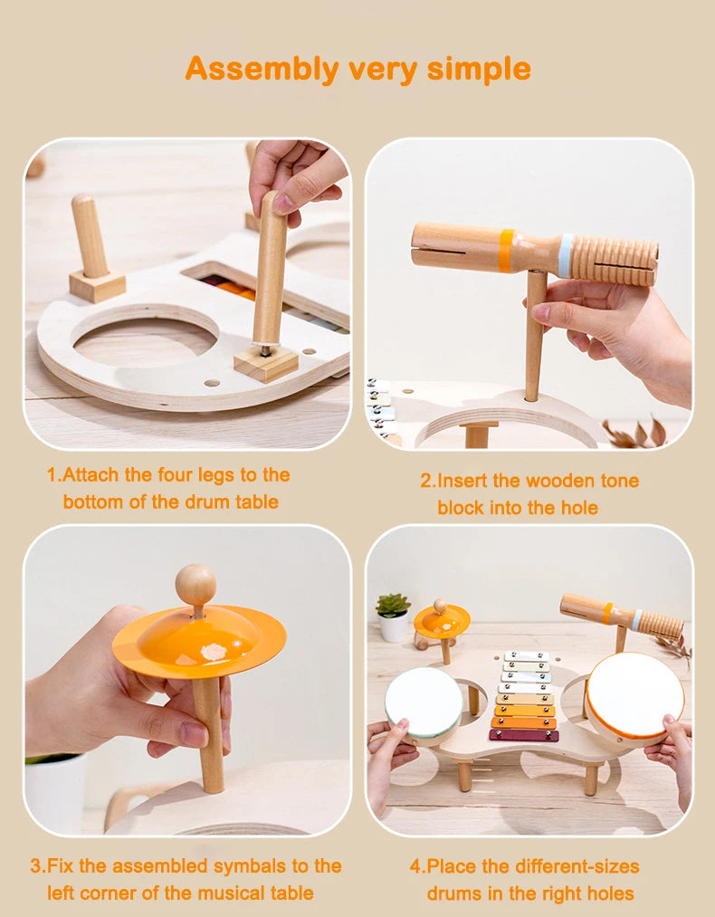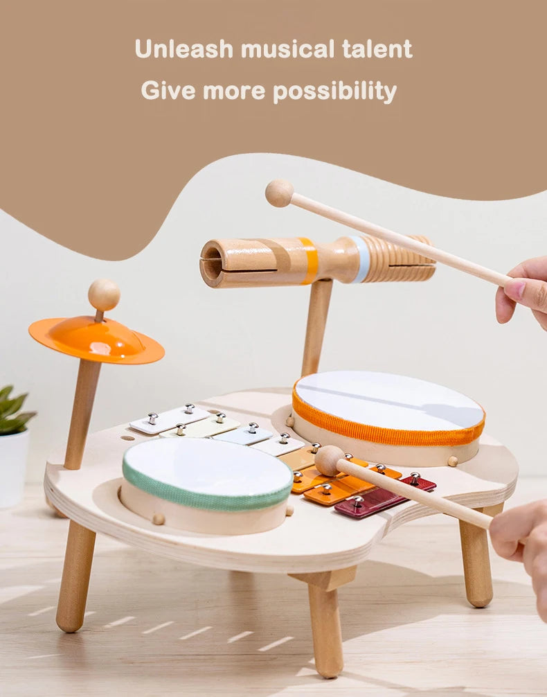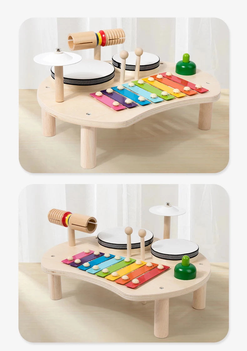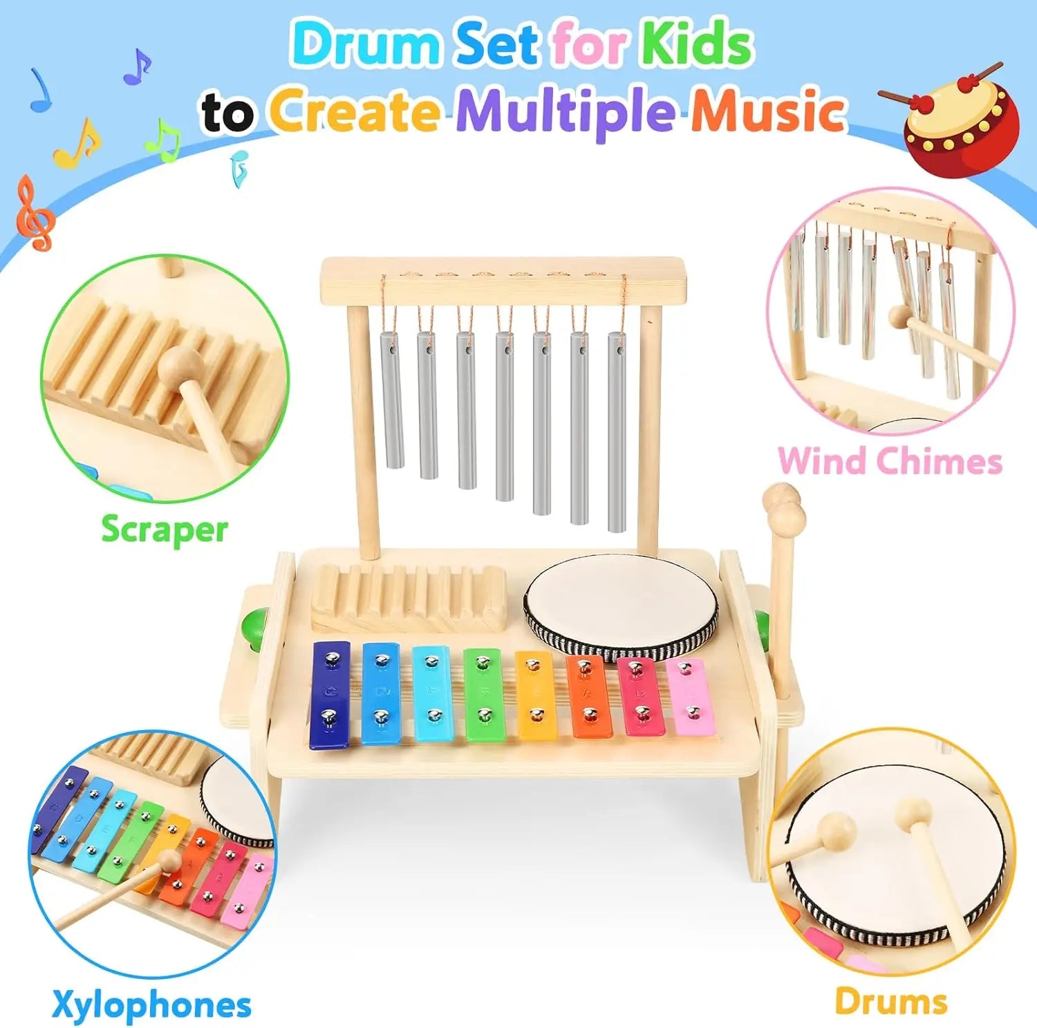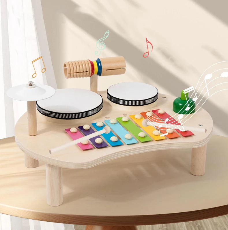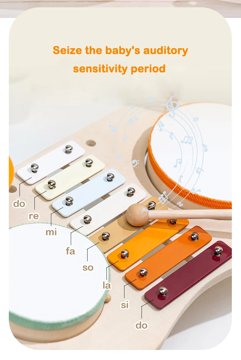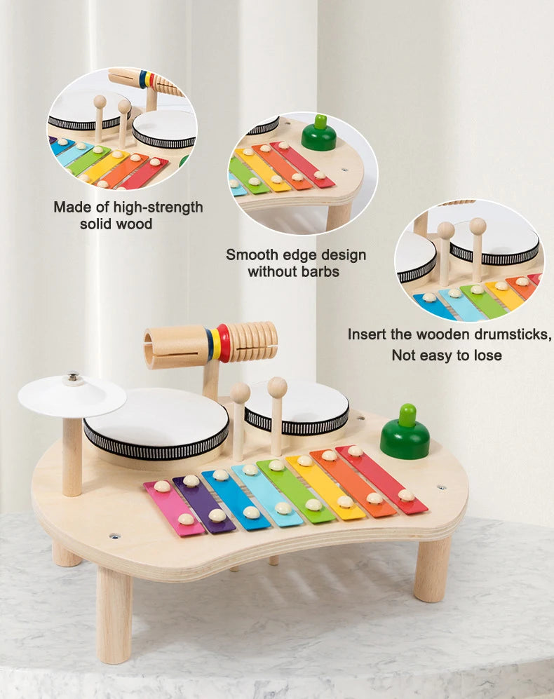 يعزز الإبداع الموسيقي والحسي. مجموعة طبلة خشبية آمنة مع آلات موسيقية. مناسبة للأطفال 2-3 سنوات.