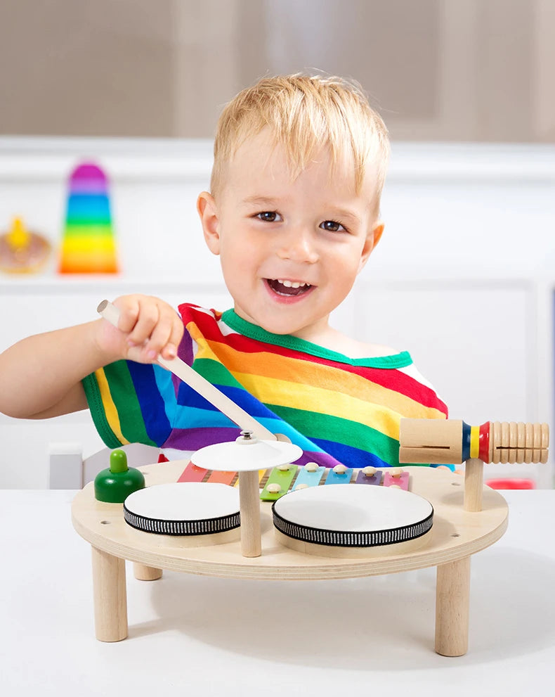 Builds musical creativity and sensory skills. Safe wooden drum set with instruments. Suitable for 2-3 year olds.